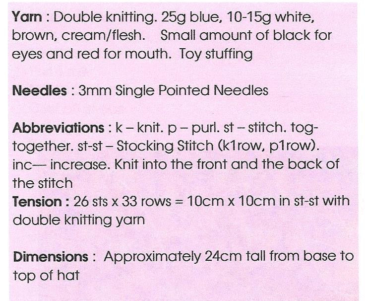 Design is worked in double knitting yarn and uses 3 mm single pointed knitting needles.